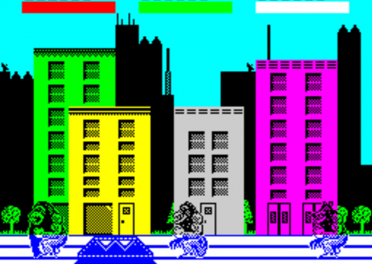 It seemed like any other day at the Greaseburger Fast Food Emporium — but three unlucky customers were to get something even nastier than usual in their Big Mucks. If only the company’s Research Division hadn’t accidentally shipped some of the experimental food additives… A wave of nausea, a foul aftertaste, chronic indigestion: everything was normal until George, Lizzie and Ralph ripped out of their clothing and into designer fur and scales. Life isn’t fun as a fifty-foot gorilla, Lizard or Wolfman — and soon everyone’s going to find out how angry they are! Up to three people can play, each controlling a different monster. In a desperate battle for survival, you climb the skyscrapers and smash the walls with your fists, searching for edibles — anything from goldfish bowls to the occasional tasty human — that appear behind the shattered windows. Grabbing inedibles such as toasters, TV’s and potted cacti will inflict some damage on you, though. Each player’s stamina is indicated by the energy bars at the top of the screen. Damaged buildings will eventually collapse into rubble, but leap off when the foundations start to give way — getting trapped in the falling masonry will weaken you. The nation’s military might is also bent on your destruction, so try to avoid (or punch) the troops who fire from the windows, and the gunship helicopters that are constantly circling overhead. You can also punch — and be punched by your fellow monsters. If you lose all your energy, you revert back to human form and, hiding your nakedness as best you can, shuffle off-screen in embarrassment.